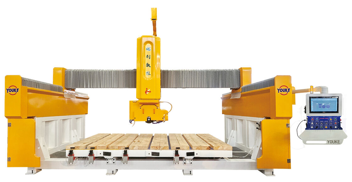 Máy kết hợp một hệ thống cắt cầu 5 trục tùy chỉnh, với hệ thống CNC giao tiếp với ổ servo Inovance thông qua giao tiếp bus tốc độ cao.Các tính năng chính bao gồm vận hành JOG bằng tay, chức năng liên kết RTCP (Rotating Tool Center Point) và nhập trực tiếp các tệp CAD, đảm bảo luồng công việc gia công mượt mà và linh hoạt.Nhờ hệ thống đáp ứng nhanh và độ chính xác điều khiển cao, máy cung cấp kết quả gia công hiệu quả, chính xác và lặp lại, làm cho nó trở thành một giải pháp đáng tin cậy cho xử lý đá hiệu suất cao và vật liệu ngâm.